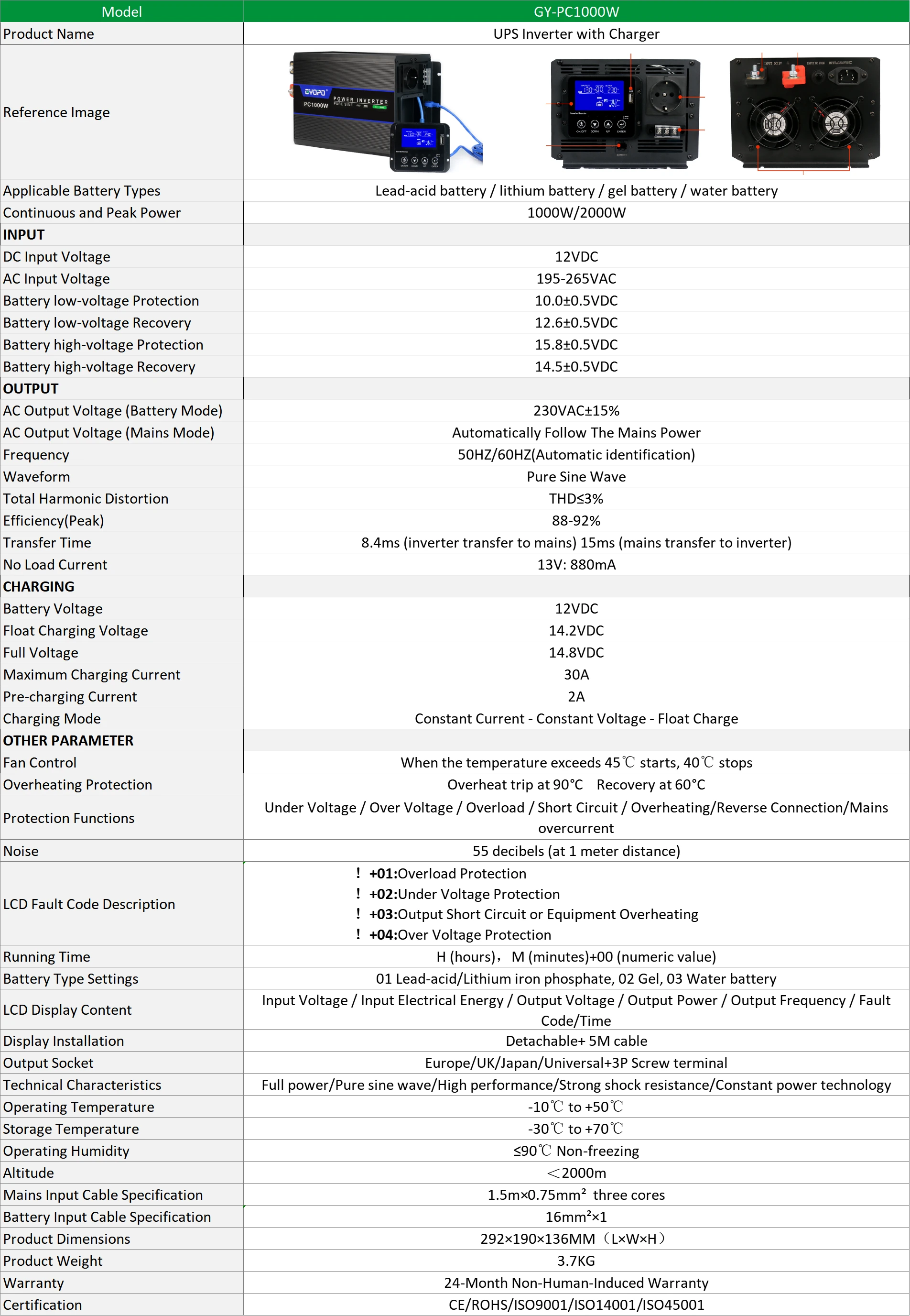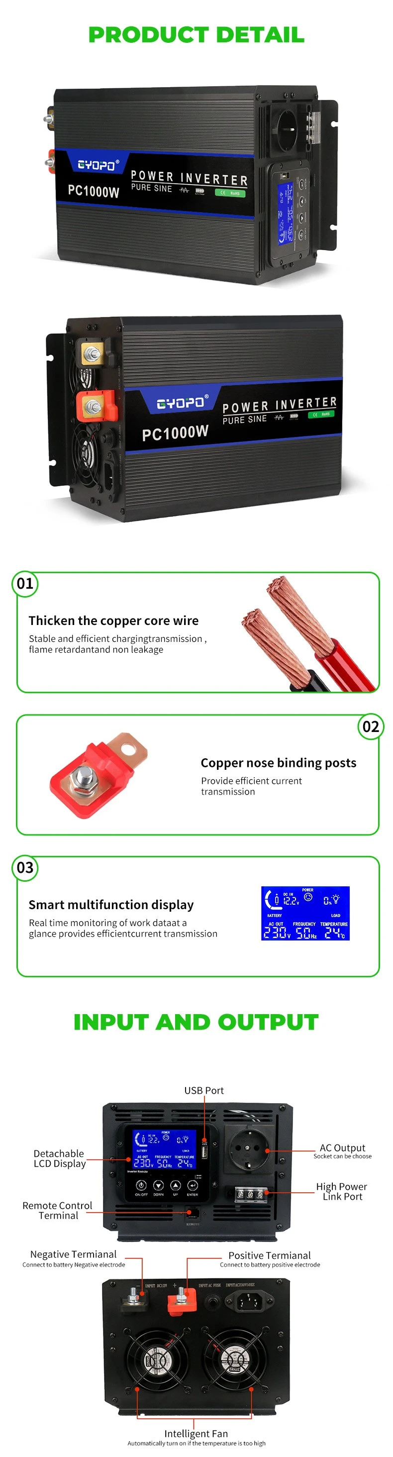 ✅ User-Friendly Design & Monitoring: Features a detachable LCD display for easy remote monitoring of input/output voltage, power, frequency, and system status. Clear LED indicators and fault codes make operation and troubleshooting simple.