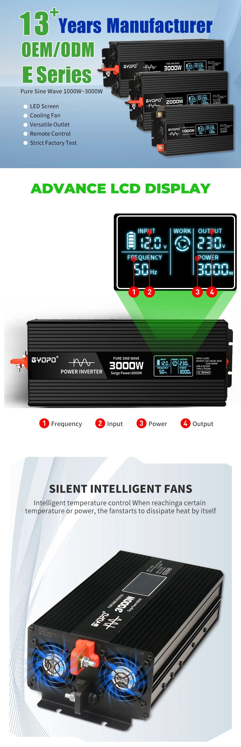 Introducing the GY-E3000 Pure Sine Wave Power Inverter from Wuhan Guanyou New Energy Technology Co., Ltd. – a high-performance, compact, and reliable power conversion solution designed for both everyday and demanding applications.