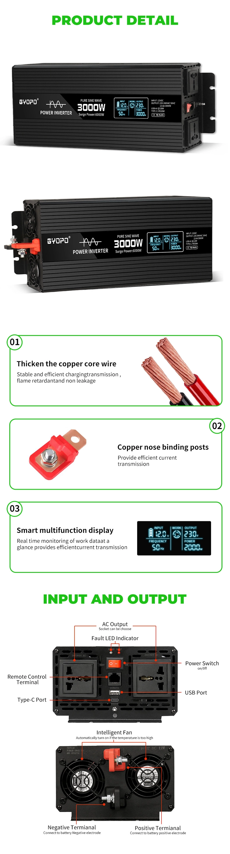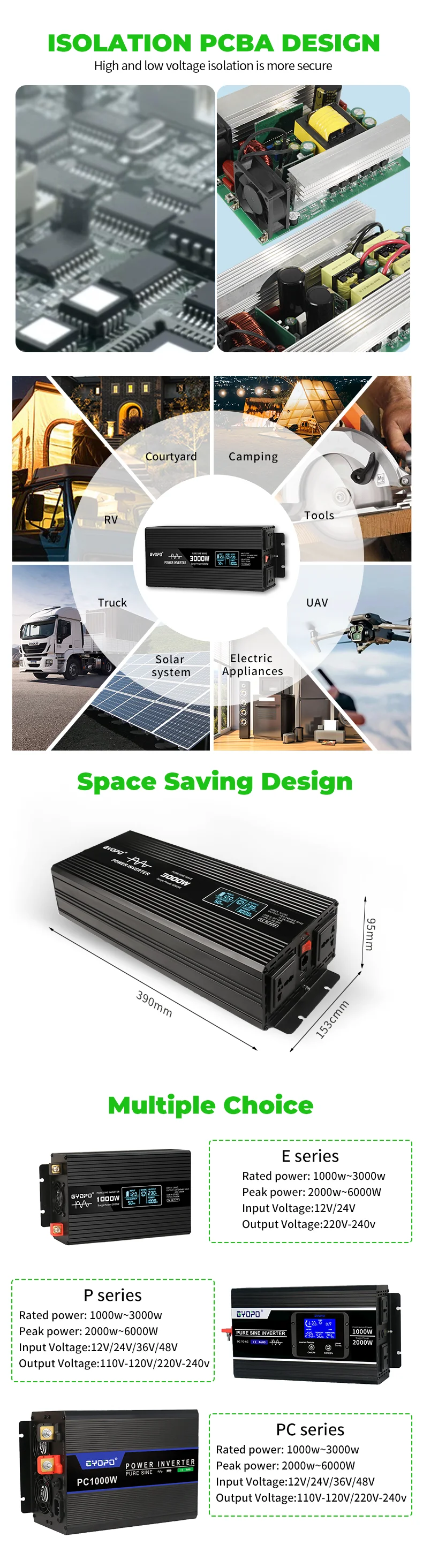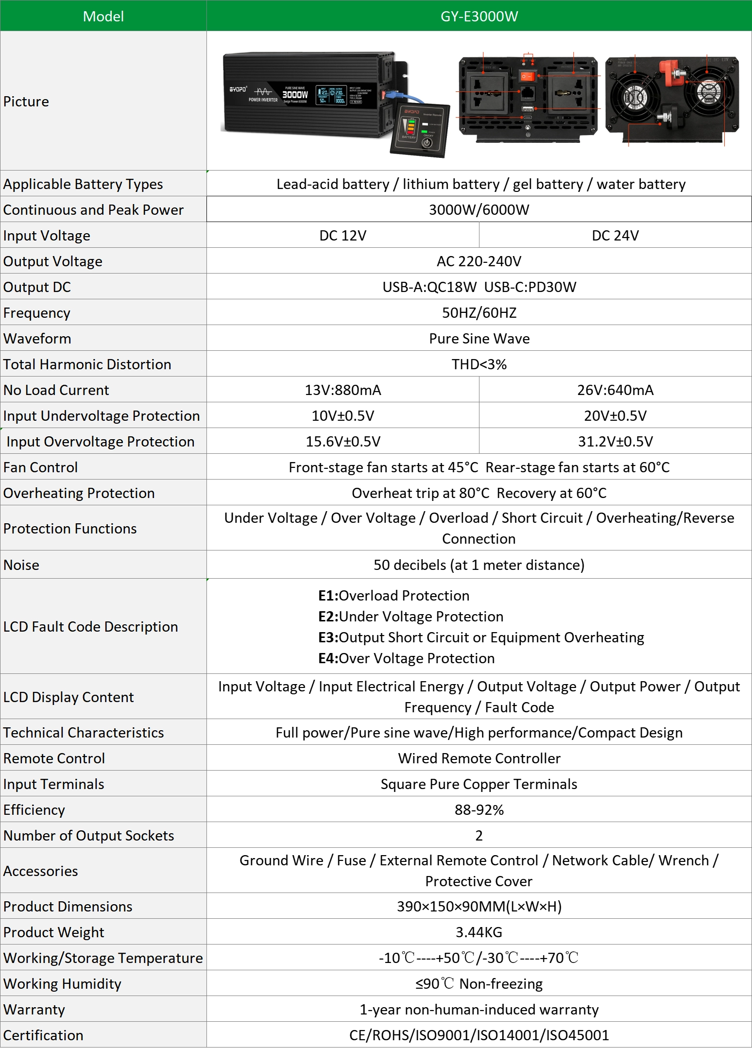 With a continuous output of 3000W and a peak power of 6000W, the GY-E3000 delivers real, stable power without overrating—ensuring safe and efficient operation for your sensitive electronics.