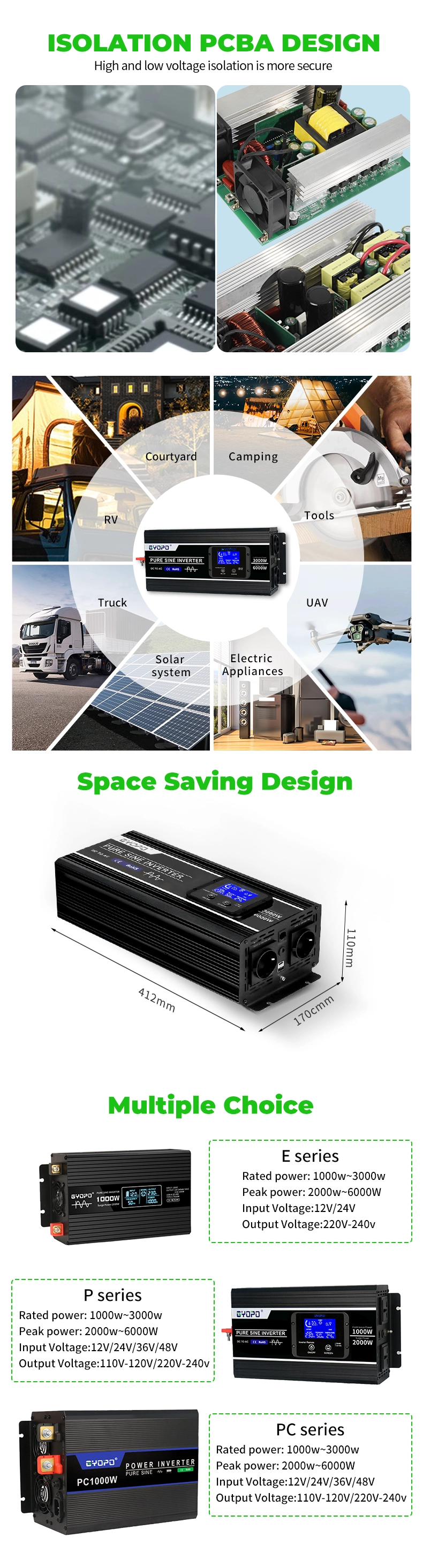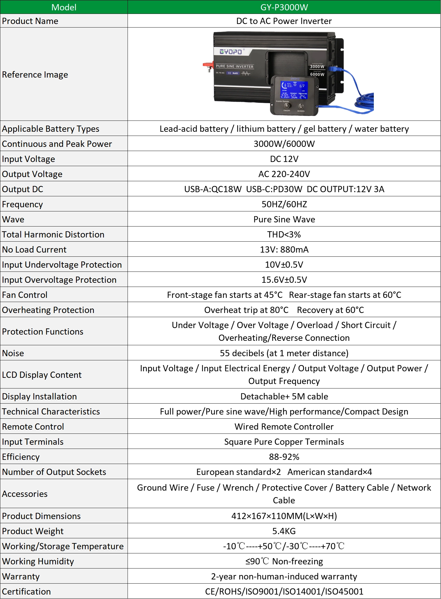 - Output Voltage: 110V/120V/220V/230V/240V