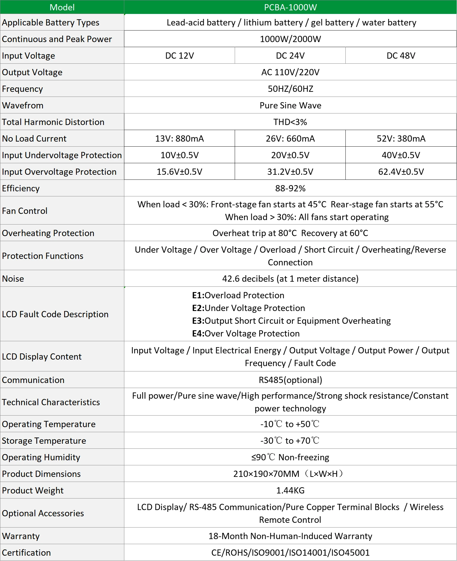 * Supports optional LCD display, remote control, and terminal blocks for easy monitoring of voltage, power, frequency, and fault codes (E1–E4).