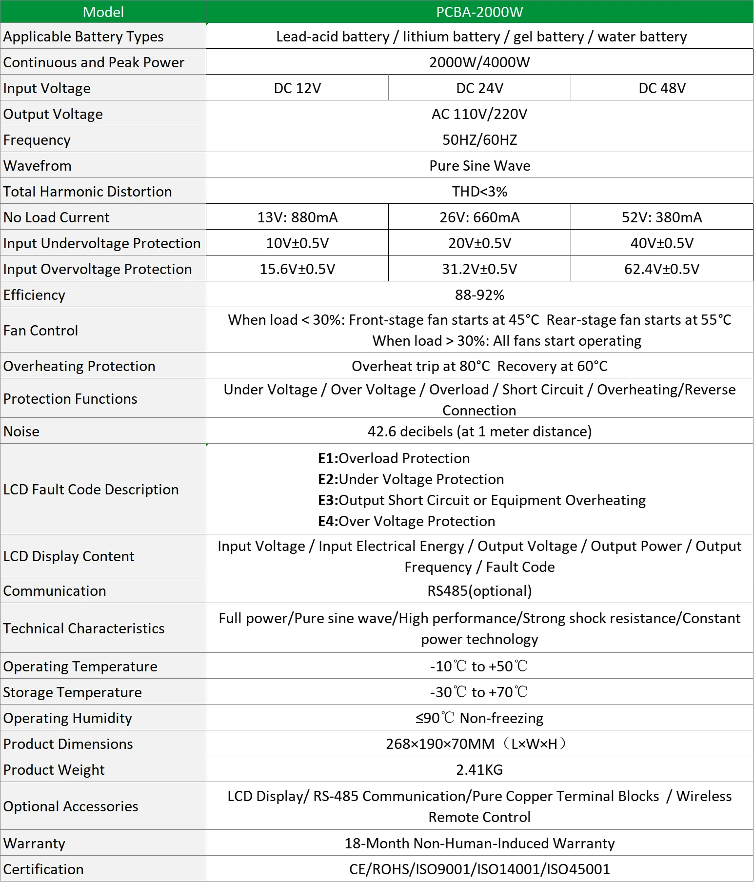 * Supports optional LCD display, remote control, and terminal blocks for easy monitoring of voltage, power, frequency, and fault codes (E1–E4).